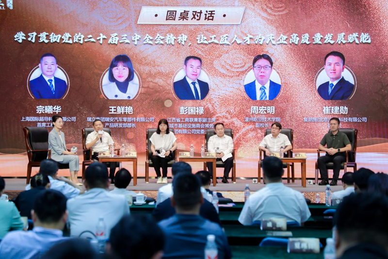 入选2024年大国工匠培育对象的上海国际超导科技有限公司首席工程师宗曦华、瑞立集团瑞安汽车零部件公司产品研发部部长王鲜艳、中大控股集团有限公司董事长彭国禄、温州职业技术学院副校长周宏明、复朗施(北京)纳米科技有限公司董事长崔建勋进行了圆桌对话。